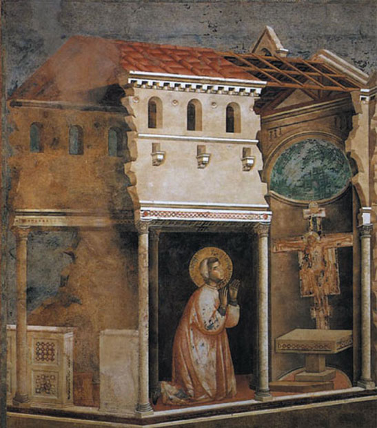Джотто ди Бондоне. Серия фресок «Легенда о святом Франциске Ассизском». Франциск преклоняется перед распятьем. 1297–1299. Базилика святого Франциска в Ассизи, верхний храм