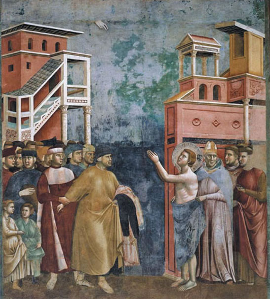 Джотто ди Бондоне. Серия фресок «Легенда о святом Франциске Ассизском». Франциск отказывается от имущества. 1297–1299. Базилика святого Франциска в Ассизи, верхний храм