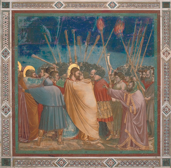 Джотто ди Бондоне. Серия фресок «Сцены из жизни Христа». Арест (Поцелуй Иуды). 1304–1306. Капелла дель Арена в Падуе, южная стена