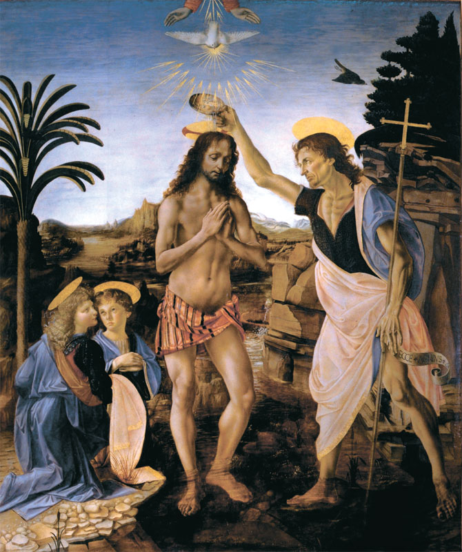 Андреа Верроккьо, Леонардо да Винчи. Крещение Христа. 1472–1475. Галерея Уффици, Флоренция