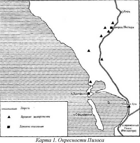 Отыскать Пилос царя Нестора оставалось на протяжении длительного времени невыполненным долгом эгейской археологии. От древних времен от него остался лишь ничего не говорящий греческий стих: «Есть перед Пилосом Пилос, но есть еще Пилос и третий»,26 служивший в античности своеобразным комментарием к факту существования в Древней Греции нескольких городов с таким названием. Когда вскоре после Троянской войны — где-то около 1200 г. до н. э. — произошло крушение мира микенских ахейцев, город Пилос подвергся столь сильному разрушению, что в I тысячелетии до н. э. честь считаться Пилосом Нестора оспаривали по крайней мере три города: один — на юго-западе Пелопоннеса в Мессении, второй — в Трифилии, области на западном побережье полуострова, и третий — в Элиде, к западу от Олимпии. Тогда-то и возник упомянутый выше стих, говорящий о трех различных Пилосах.