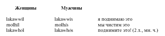 Второе правило может быть объяснено принципом морфо-фонемической экономии (тенденция упрощения слов, имеющаяся во всех языках, например omnibus – bus, refrigerator – fridge и т. д.). Другими словами, по-видимому, мужской язык сохраняет исторически старые формы. Сепир полагает, что сокращенные женские формы символизируют низкий статус женщины: мужские же полные формы ассоциируются с этикетом и официальностью. Это занятный случай связывания мужской речи с консерватизмом и чистотой языка – характеристиками, которые обычно ассоциируются с женским языком (подробнее об этом в главах 4 и 8).
