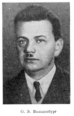 О. Э. Вольценбург в 20-е годы был одним из виднейших библиотечных и библиографических работников Ленинграда. Он родился в 1886 г. на мызе Ванга Царскосельского уезда Петроградской губернии, сразу же после революции стал работать в политико-просветительных учреждениях Петроградского губернского отдела народного образования. Был заведующим библиотекой ленинградского отделения Коммунистической академии, главным библиотекарем ленинградского отделения Гос. центральной книжной палаты, преподавателем гос. книжного техникума и автором ряда библиографических и библиотековедческих работ, среди которых особо ценны «Библиографический путеводитель по революции 1905 г.» (1925), «Библиография изобразительного искусства» (2 вып., Пг., «Книжный угол», 1923). Необыкновенно красивый, мягкий, сразу привлекавший людей своей манерой простого и доброжелательного обхождения, Вольценбург был обаятельнейшей фигурой среди ленинградских библиофилов 20-х годов и особенно выигрывал на фоне Голлербаха, вне своего дружеского кружка державшегося высокомерно, с подчеркнутым эстетством и «аристократизмом». В ЛОБ Вольценбург выступал с докладами о библиотеке Академии наук (в связи с 200-летием последней), о книговедческой и библиофильской деятельности А. М. Ловягина, А. Д. Торопова и Н. А. Рубакина, об изданиях русских провинциальных художественных музеев за революционное десятилетие, а также знакомил членов общества с новинками библиотековедческой и библиографической литературы, давая живые и содержательные оценки их. Уже в это время Вольценбург работал над трудом всей своей жизни — библиографическим словарем русских художников, к сожалению, так и не опубликованным до сих пор; с присущей ему скромностью и тактичностью, он никогда не говорил об этом предмете публично.