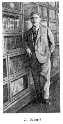 О библиотеке Демьяна Бедного ходили баснословные слухи. Говорили, что она насчитывала чуть ли сто тысяч томов и занимала будто бы всю квартиру поэта сначала в Кремле, затем на ул. Димитрова и целую дачу под Москвой. Однако в печати — и совсем незадолго до того, как библиотека была ликвидирована — указывалось, что в ней насчитывается 30 тыс. книг. Во всяком случае, она считалась и считается первой по величине и по своему подбору книг среди библиотек советских библиофилов за все время после 1917 г.