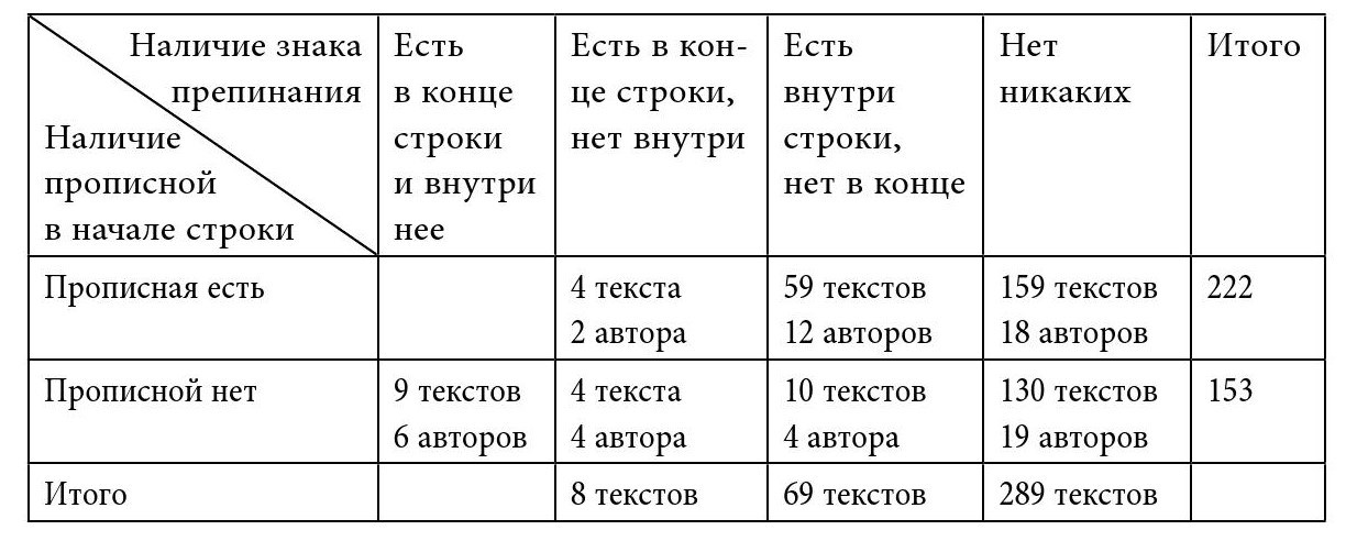 Сопоставление этих данных с какими-то данными по многострочным текстам наталкивается на трудности двоякого рода. С одной стороны, неясно, какую выборку многострочных текстов можно считать репрезентативной для такого сравнения: моностихи для нашего собрания отбирались, как уже было отмечено, у авторов очень разных по своей поэтике, и отбор многострочных текстов для корректного сопоставления должен был бы проводиться с учетом эстетических приоритетов изданий-источников. С другой стороны, у многострочных текстов возникает более сложная градация возможностей, которым трудно найти соответствие в моностихе (например, присутствие знаков препинания в конце строфы при отсутствии в других позициях et vice versa, наличие прописной в начале строф или полустрофий, но не всех строк, и т. д.). Тем не менее некоторые подсчеты были проделаны. За основу был взят раздел «Непохожие стихи» в антологии «Самиздат века» [Самиздат 1997, 341–752], поскольку в нем представлены, главным образом, авторы неподцензурной поэзии 1950–80-х гг. Из рассмотрения были исключены значительно более ранние тексты (1930–40-х гг.) и несколько произведений, чей стихотворный статус сомнителен (визуальная поэзия Вилена Барского, проза Андрея Монастырского и Сергея Круглова и др.). В результате был обследован 1041 текст 240 авторов (от одного до 30 текстов каждого автора – в объеме публикаций антологии). Отказ от употребления знаков препинания зафиксирован в 264 текстах 40 авторов – те же 25 % от общего количества стихотворений. Из них прописная буква в начале стихов (всех или некоторых) присутствует в 163 текстах и отсутствует в 110 (еще один текст целиком дан прописными буквами) – процентное соотношение 59:41 (у моностихов, как видно из таблицы, 62:38). Учитывая изначальную проблематичность предпринятых сопоставлений, близость полученных результатов кажется довольно красноречивой, но для каких-либо выводов этот сравнительный материал недостаточен.