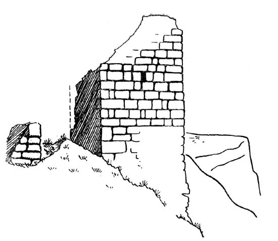 Между первой и второй линиями обороны восточного утеса, в зарослях, сохранились остатки древних фундаментов, водосборных лотков и т. п. Вторая внутренняя [34] линия обороны охватывает этот утес по его средней Части. Стена тянется от обрыва до обрыва в длину на 60 м, прерываясь в середине проемом ворот. У северного обрыва эта стена достигает восьмиметровой высоты. Кроме того, здесь для полной безопасности скала надстроена и облицована каменным панцирем, благодаря чему высота стены увеличивается еще на 12 м.