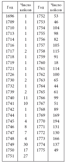 Как уже говорилось, в нашей базе данных зафиксировано 2448 случаев (кейсов)[51] за период 1696–1775 гг. Оценить степень репрезентативности этой базы достаточно сложно. С одной стороны, это ничтожно малое число по сравнению с упоминавшимся выше числом записей в книге протеста векселей по Петербургу. Но, с другой, нас в данном случае интересует не столичный, а именно провинциальный город, заведомо не являвшийся крупным торговым центром. Поэтому сама эта цифра определенным образом его характеризует. Если в Петербурге в 1773 г. было учтено 4 тыс. опротестованных векселей, а в Бежецке за этот же год всего 166, то можно сделать вывод о том, что по объему совершавшихся в нем операций Бежецк уступал Петербургу примерно в 25 раз. Если же не учитывать 926 петербургских векселей, составленных с участием иностранных купцов (которым в Бежецке, не являвшемся морским портом, делать было нечего), то преобладание столицы над провинцией будет составлять 18,5 раз. В самих этих цифрах нет ничего удивительного, но стоит обратить внимание на то, что по размерам населения Петербург превосходил Бежецк примерно в 60 раз. Сопоставление этих цифр, говорит скорее в пользу Бежецка и указывает на достаточно высокий уровень хозяйственной активности его обитателей.[52]