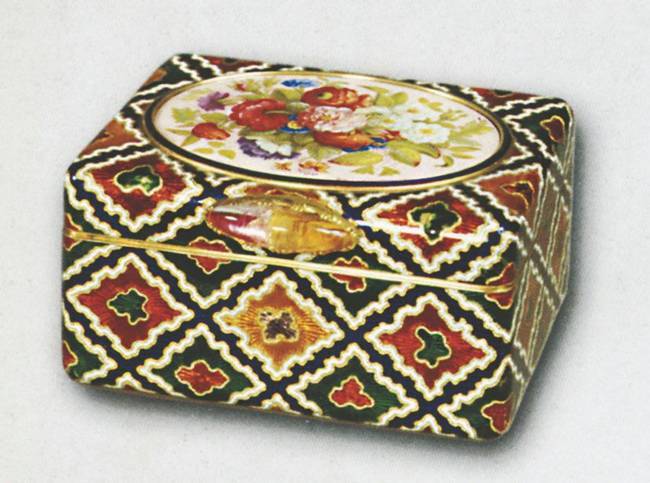 Рис. 1. Карл Хелфрид Барбе. Табакерка цветной эмали. Золото, кварц, эмаль, фольга; полировка, роспись. 3,8 ? 7,6 ? 5,5 см. Около 1850 г. ГЭ