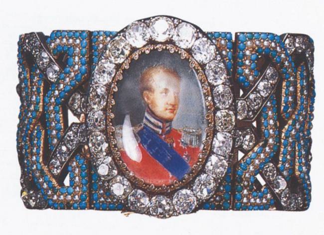 Рис. 3. Иоганн Христиан Барбе. Браслет с портретом (миниатюра) Николая I. Золото, серебро, бриллианты, бирюза, мелкий жемчуг. На миниатюре надпись «Winberg». 1842 г.