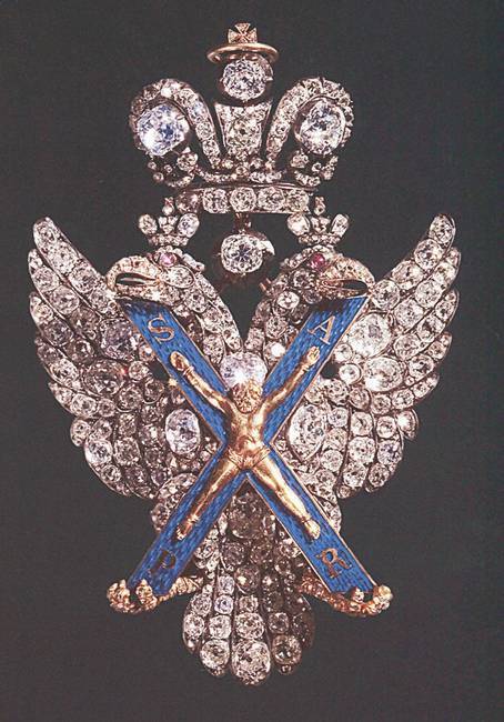 Рис. 7. Знак (наверху) и звезда ордена Св. Андрея Первозванного. Золото, серебро, бриллианты, алмазы огранки «роза», рубины, эмаль; гравировка, роспись. Знак 5,5 ? 8,7 см, звезда диаметром 8,3 см. Около 1800 г. ГЭ