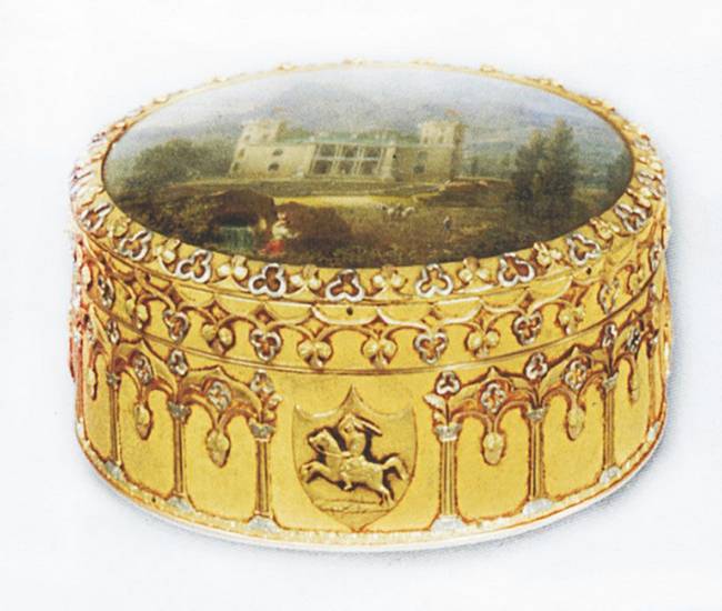 Рис. 9. Иоганн-Вильгельм Кейбель. Табакерка с изображением имения Голицыных Гаспра в Крыму. Золото, миниатюра, смальта, стекло; полировка, чеканка, мозаика, пунцирование, роспись. 3,5 ? 8,3 ? 7,3 см. Конец 1860-х гг. ГЭ