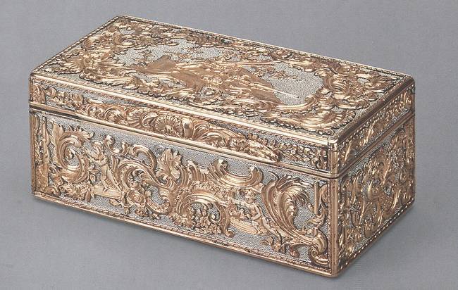 Рис. 10. Иоганн-Вильгельм Кейбель. Табакерка. Платина, золото, чеканка; полировка, гравировка, пунцирование. 3,8 ? 8,8 ? 4,2 см. Середина XIX в. ГЭ