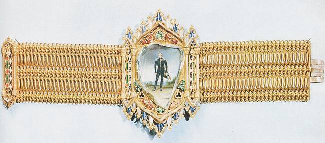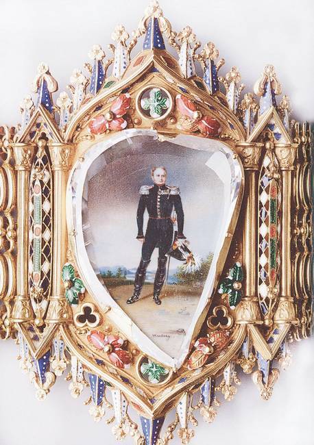 Рис. 13. Иоганн-Вильгельм Кейбель. Браслет с портретом Александра I. Золото, портретный алмаз, эмаль, кость, акварель. Длина браслета 20 см. Вес 129,4 г. Портретный алмаз 27,0 кар. 4, 0 ? 2,9 см. Толщина пластины 2,5 мм. Первая половина XIX в. АФ