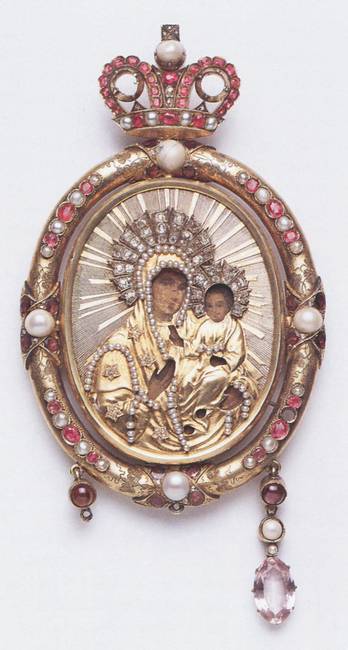 Рис. 24. Фирма «Английский магазин», мастер Самуэль Арнд. Панагия «Богоматерь Смоленская». Золото, серебро, рубины, бриллианты, жемчуг, эмаль, аметисты, а льмандин, перламутр. 11, 5 ? 7,1 см. 1855 г. ГЭ