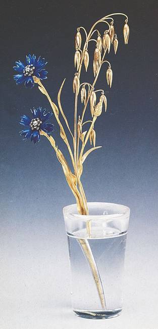 Рис. 29. Васильки с колосками овса. Фирма Фаберже, мастер Михаил Перхин. Золото, бриллианты огранки «роза», эмаль, горный хрусталь. ГЭ
