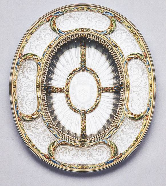 Рис. 30. Блюдо с гербом Петербурга. Фирма Фаберже, мастер Михаил Перхин. Горный хруста ль, серебро, алмазы, эмаль; резьба, шлифовка, гравировка, золочение. ГЭ