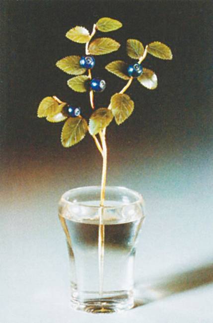 Рис. 34. Ветка черники в хрустальном стакане. Мастерская Х. Вигстрёма. Золото, нефрит, лазурит, горный хрусталь; резьба, полировка. 1910-е гг.