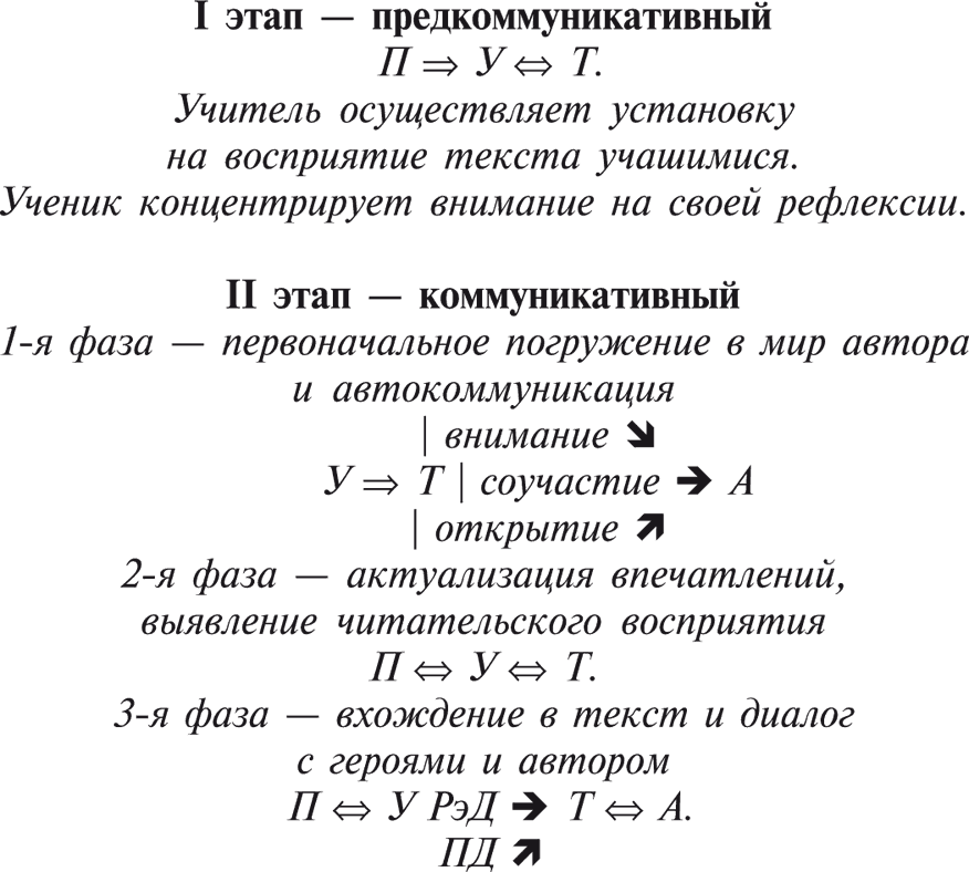 Коммуникация закончилась, теперь она переносится во внутренний план, ведется диалог между «Я» и «Ты» в сознании учащегося. Это самый важный диалог. Он проходит уже без вмешательства педагога и носит сугубо интимный характер. Наличие его – свидетельство глубокого воздействия текста на личность реципиента, способности его самостоятельно творить свой Образ. Таким образом, посткоммуникативная фаза изучения художественного текста – это и приобретение реципиентом новых художественных ценностей, и его жизнь в культуре, создание своего Лица, он теперь сам начинает выступать транслятором этих ценностей.