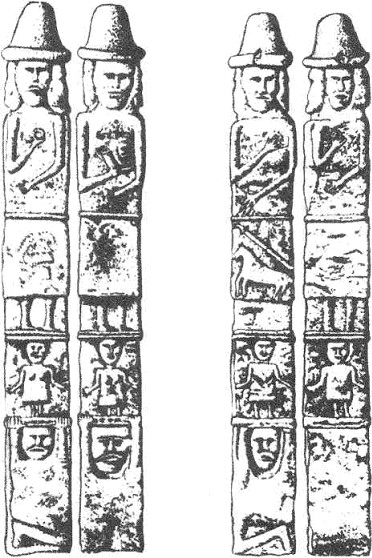 Самый известный каменный И., обнаруженный в р. Збруч (левый приток Днестра) в 1848 г., датируется X–XI вв. Предположительное его место — на ближайшем городище-«святилище» Богит (у г. Гусятин, Тернопольская обл.), часть находок на мысу которого интерпретируется как остатки человеческих (детских) жертвоприношений И. (при большей вероятности того, что это следы разгрома городища врагами). Четырехгранный столб из серого известняка, высотой 2,67 м, увенчан изображением четырехликого и четырехтелого «божества» под одной шапкой, придающей И. в целом фаллическую форму. На одной стороне женский персонаж (с подчеркнутой грудью) держит в руке кольцо (браслет), на другой — питьевой рог, на третьей — мужской персонаж с саблей у пояса (оружие, не характерное для древних славян) и изображение коня, на четвертой — антропоморфный персонаж, лишенный специальных атрибутов. Средний фриз изображает хоровод из двух женских и двух мужских фигур, держащихся за руки; нижний фриз несет изображения трех фигур, поддерживающих руками верхние ярусы; свободная от изображений сторона нижнего фриза интерпретируется как часть, к которой примыкал жертвенник.