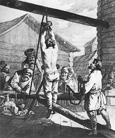 Соответствующие взгляды формировались и благодаря практиковавшимся государственной властью публичным казням. Наказания были своего рода театром, массовым представлением, красочной церемонией, которые были сродни, а иногда даже превосходили в варварстве само преступление. Они прививали населению вкус к кровавым зрелищам, в которых смерть играла заглавную роль, приучали зрителей к жестокости. Например, Соборное уложение 1649 года предусматривало пять видов смертной казни, но реальная практика не ограничивалась ими, а прибегала и к другим способам исполнения этой меры наказания. Однако «ужасы повешения, колесования, четвертования и другие изуверские способы смертной казни нисколько не возмущали общественное мнение... Ужасы смертной казни не производили какого-либо потрясающего впечатления, не вызывали протеста и отвращения» [137; 24, 28 – 29].