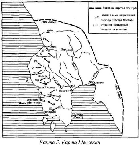 Определение территории отдельных провинций Пилосского царства позволяет также установить общую конфигурацию и размеры владений царя Нестора. Довольно хорошо прослеживается восточная граница, проходившая по горному массиву Тайгета и спускавшаяся к морю по его югозападным отрогам на юго-востоке от нынешней Каламаты. К аналогичным выводам мы приходим и на основании других данных, полученных при анализе табличек, которые указывают, что восточная провинция была надежно защищена со стороны побережья. Северная граница державы Нестора проходила всего лишь в 40-50 километрах от дворца Нестора — как раз там, где к западному побережью Мессении подходят высокие горы, спускающиеся к морю недалеко от нынешней деревни Каковатос, возле которой В. Дерпфельд обнаружил упоминавшиеся выше микенские гробницы.