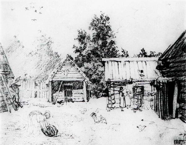 Деревенский дворик. Лист из альбома 1807 года. Бумага, итальянский карандаш. Ленинград. Русский музей.
