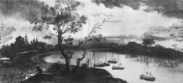 Пейзаж с рекою в лунную ночь. 1810-е годы. Бумага, итальянский карандаш, белила. Москва. Третьяковская галерея.