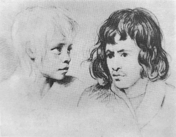 Наброски голов крестьянского мальчика и неизвестного. Лист из альбома 1807 года. Бумага, итальянский карандаш, мел. Ленинград. Русский музей.