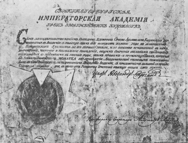 Диплом О. А. Кипренского об окончании Академии художеств. Москва. Архив внешней политики России.