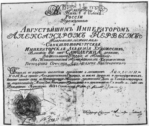 Диплом об избрании О. А. Кипренского академиком Петербургской Академии художеств. Москва. Архив внешней политики России.