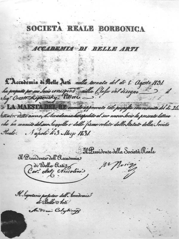 Диплом об избрании О. А. Кипренского почетным академиком Неаполитанской Академии художеств. Москва. Архив внешней политики России.
