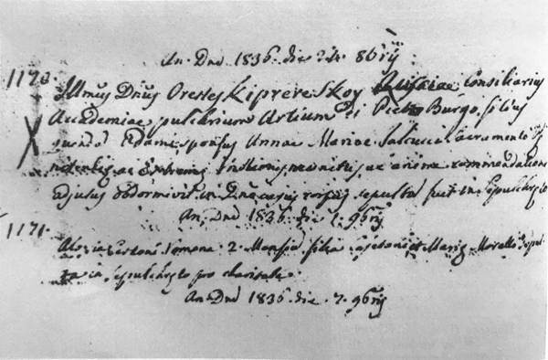 Запись в «Книге усопших» римской церкви Сант’Андреа делле Фратте о смерти О. А. Кипренского. Рим. Архив викариата.