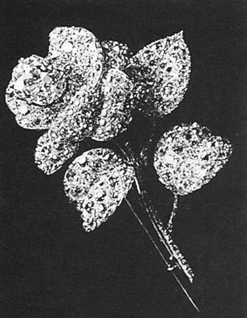 Можно только сожалеть, что в Алмазном фонде нашей страны не сохранилась красавица-роза, судя по виртуозности закрепки, вне всяких сомнений, созданная в мастерской Августа Хольмстрёма в последние годы XIX столетия. Вполне возможно, что прототипом её стал хранившийся среди фамильных драгоценностей императорской семьи дивный цветок «чарующего впечатления», с бразильскими алмазами, закреплёнными в серебряной ажурной оправе, из которых выделялся образующий сердцевинку «царицы цветов» индийский солитер в 38,75 карат, а листочки были закреплены подвижно на штифтах.[722] Эту чудную вещь, вероятно, в 1830-е годы сделал оставшийся неизвестным ювелир для императрицы Александры Феодоровны, прозванной «Белым цветком».