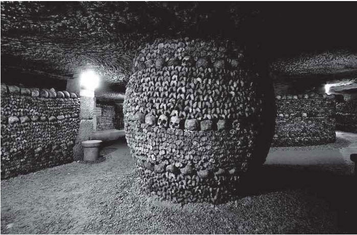 Между тем к югу от реки вовсю кипела работа: с 1810 года Фрошо и генеральный инспектор каменоломен Луи-Этьен-Франсуа Эрикар-Ферран, виконт де-Тюри, были заняты «переоборудованием» катакомб в «сентиментальный» некрополь. В 1815 году, Тюри опубликовал «Описание катакомб», где была документально представлена история этих удивительных сооружений, начиная с расчистки кладбища Невинных в 1785–1786 годах. Вход в катакомбы укрепили, черепа и кости аккуратно сложили вдоль стен так, что они образовали неоклассический орнамент, установили часы посещений и разработали маршруты. Создатели парижских катакомб явно придерживались древних традиций организации римских оссуариев, тесно связанных с ранней историей христианской церкви. Хотя в апреле 1786 года катакомбы освятили и даже поставили рядом с входом часовню, по стилю и общему романтическому настроению они скорее соответствовали поэме Юнга, чем формальному церковному пространству. Позже сюда добавили доски с выдержками из классических текстов и цитатами из произведений великих поэтов.