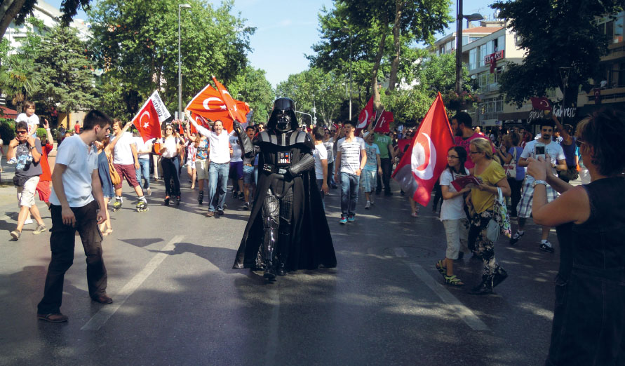 Теперь перенесемся в 2013-й, когда площадь Таксим стала центром совсем другой полицейской активности. Люди вышли на площадь после того, как полиция применила слезоточивый газ для разгона мирной демонстрации против сноса местного парка, на месте которого было решено построить торговый центр. Кетин решил, что присоединится к протесту, вновь одевшись в костюм Вейдера. Смысл, который он в это вкладывал: «даже знаменитый кинозлодей выступает на стороне народа».