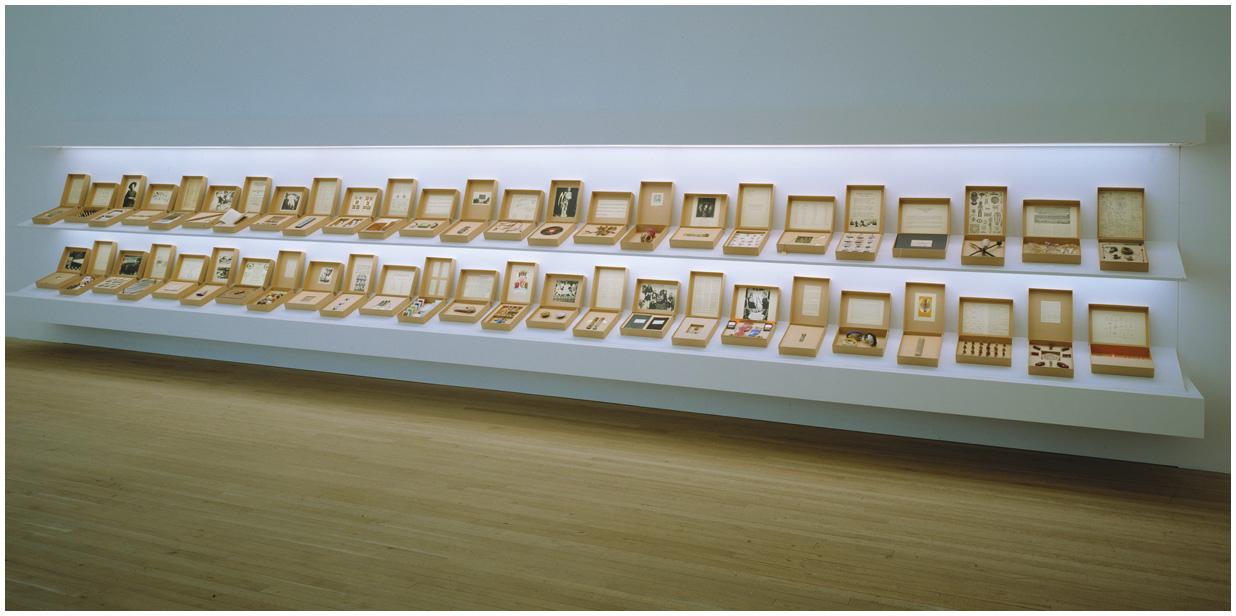 Витрина с 50 коробками, видео (15 мин.). 220?1000?60 см. 1991–1996 гг. Современная галерея Тейт, Лондон