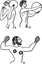 Бросающие становились на особо устроенное возвышение и, слегка нагнув туловище, упирались правой ногой, а левую отставляли немного вперед; копье брали посередине и, подняв его горизонтально на уровень уха, бросали, подавшись туловищем немного назад или вперед; диски поднимали только на уровень плеча и кидали их дугой (ср. рис. 149, а, б).