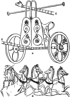 Колесницы, которые использовались исключительно для ристалищ, ничем не отличались от военных колесниц, описанных Гомером, о чем свидетельствуют сохранившиеся изображения на скульптурах и вазах (рис. 151).