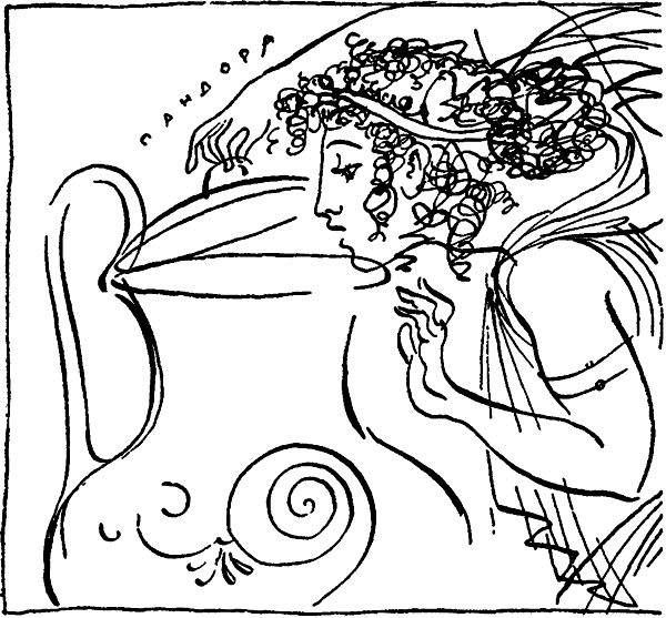 И разгневанный царь богов отомстил людям. По его приказу Гефест вылепил из глины прекрасную девушку, Афродита дала ей неотразимую прелесть, Афина одела ее в изысканные одежды, научила тканью и прядению, Гермес наделил ее лживой душой и научил льстивым, коварным речам. В общем каждый бог внес свой посильный вклад в создание существа, которое должно было принести несчастье всему человечеству. Назвали эту девушку Пандорой (то есть «Наделенной всеми дарами») и выдали замуж за брата Прометея — глупого и доверчивого титана, прятавшего в своем доме таинственный сосуд, который запрещено было открывать. Что там хранилось, никто не знал: известно было лишь, что поднять его крышку — значило принести несчастье.