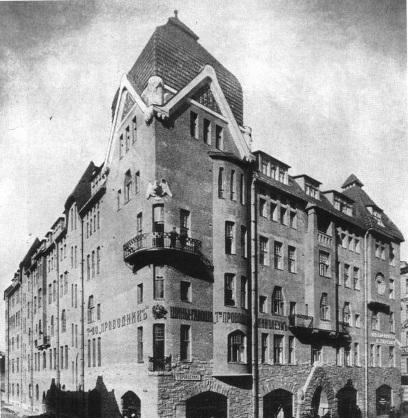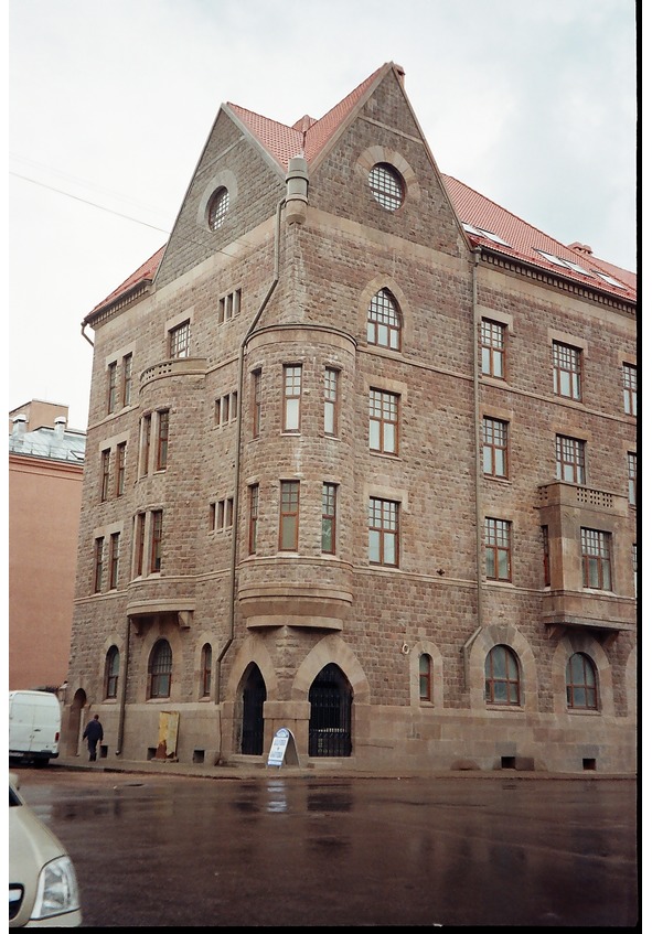 Необходимо учитывать и еще один, более конкретный и узкий «канал» влияния на петербургскую архитектуру рубежа ХIХ-ХХ вв. В 1904 году на страницах периодического журнала «Зодчий» был опубликован очерк Г.А.Путкинена под названием «Дом в Выборге».64 Речь в нем шла о ныне небезызвестном здании «Хякли, Лаллука и &», спроектированном Алланом Шульманом. Этот дом, с конторскими помещениями и жилыми квартирами, отличался выразительным обликом и, действительно, заслуживал внимания.