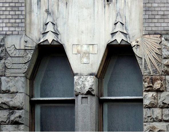 Массивные квадратные столбы, под широким арочным порталом, вместо капителей венчают фигуры чудищ, как бы сдавленных каменной массой. Внешне, их распластанные тела напоминают уродливых жаб, которые в древности ассоциировались у северных народов с магией и колдовством. И еще большая насмешка над «классикой», в некотором роде, «едкая ирония» в отношении ордерной архитектуры – миниатюрная дорическая колонна, вставленная в раму окна. Декоративный мотив в «игровой» интерпретации…