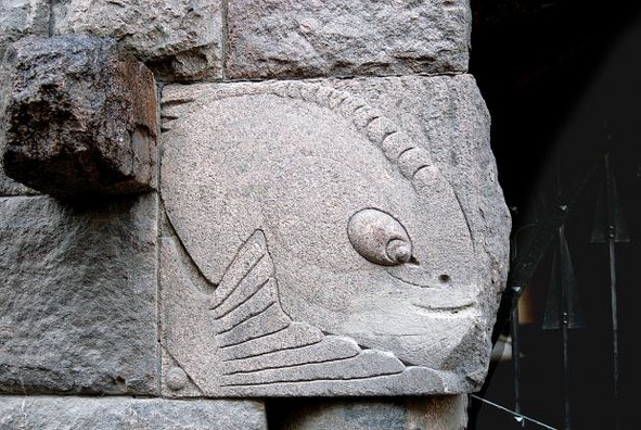 Рельефный рисунок с противоположный стороны входного портала изображает Рыбу-Солнце. Это, пожалуй, еще более загадочный персонаж. Дело в том, что подобная рыба, имеющая гигантское дисковидное тело, существует в реальности природного мира. Она обитает в бескрайних просторах океана и лишь иногда наведывается в северные моря, омывающие территорию Скандинавского полуострова. В старину балтийские рыбаки, встречая Рыбу-Солнце или Рыбу-Луну, отдыхающей на поверхности воды, обычно пугались от ее странного облика и размеров. Она вызывала у людей ассоциации с морским чудовищем. В 1908 году у берегов Австралии, и вправду, поймали рыбу, похожую на ископаемого представителя земной фауны. Длина ее составила более 4 метров, а вес превысил 2 тонны. Моряки эпохи Средневековья еще не знали, что Рыба-Солнце безобидна и не представляет угрозы для человека.
