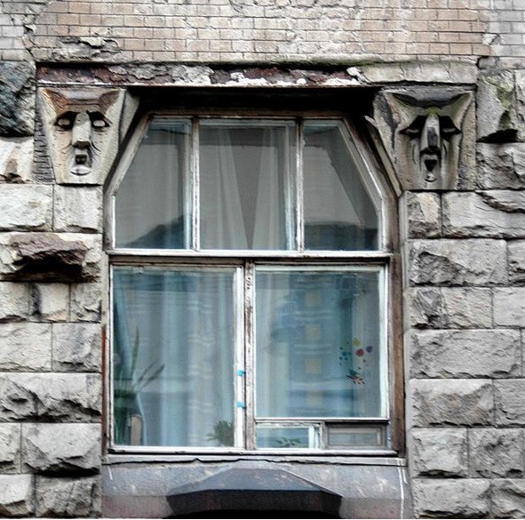 Между тем, фасадные маски в доме Угрюмовых были «вычерчены» в более резких и угловатых линиях. Внешне они напоминают примитивную резьбу по дереву, ассоциируются с языческими идолами, которым, в одинаковой степени, поклонялись в старину финны и славянские народы.