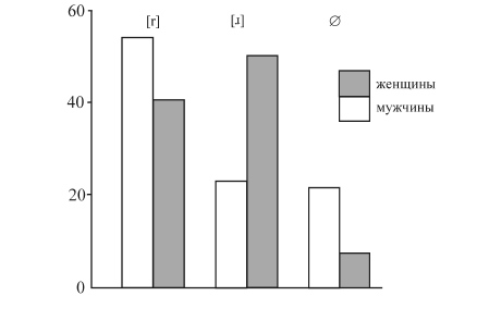 Анализ результатов Сьюзан Ромэйн позволил сделать вывод, что пол говорящего является единственным и самым важным фактором, связанным с [г]. В диаграмме 4.11 представлены результаты употребления каждой переменной для информантов, объединенных в группы по половой принадлежности.