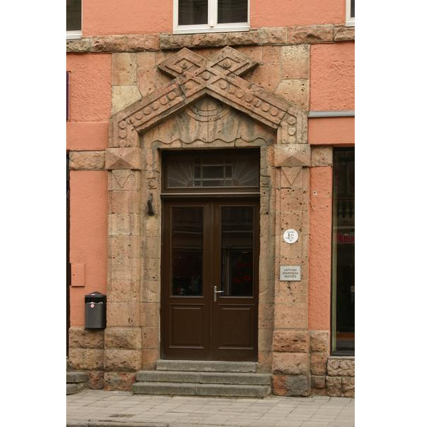 Входной портал получил характерные трапециевидные очертания, ассоциирующиеся с латышским деревянным зодчеством. Его украсили орнаментальные рисунки в духе народной вышивки и вязания.