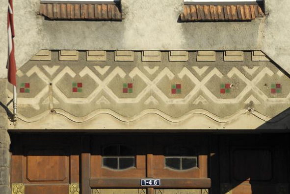 Но, пожалуй, наиболее эффектно все же выглядит рельефная вставка с цветной мозаикой, украшающая фасадную стену на уровне первого этажа. Она наглядно иллюстрирует узор из народной вышивки. Стилизация знака Месяца была достаточно распространенной в латышской национальной одежде. А. Ванаг, будучи архитектором, тоже хорошо осознавал непреходящее значение геометрических узоров, связанных своим происхождением с наследием далеких предков балтийских народов. В отсутствии литературного эпоса, его функцию в Латвии в момент подъема национального самосознания, фактически, выполнял орнамент. Незатейливые геометрические узоры и знаки представлялись творческим людям неисчерпаемым ресурсом древнего знания, в своем роде «кладовой мудрости». Кто-то из них даже пытался воспринимать рисунок на Лиелвардском поясе, как некое зашифрованное послание, обращенное в будущее.