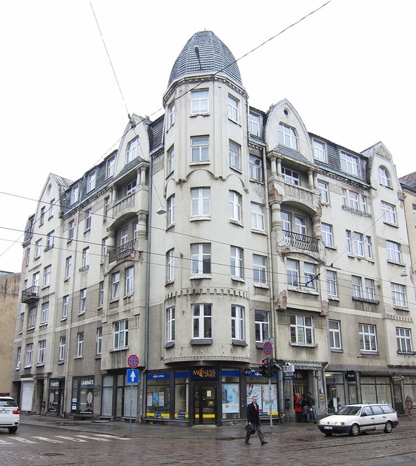 Дом на улице К.Барона (арх. А. Ванаг) с характерными декоративными элементами – «зубчиками» и «коренастыми» опорами