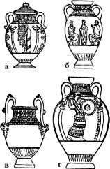 В течение V в. до н. э. под влиянием всестороннего развития эллинской жизни вместе с другими искусствами достигло совершенства и изобразительное искусство греков. С этих пор рисунок становится не только украшением сосуда, но, подчиняя свое содержание и свою композицию его формам и назначению, сливается с ним в одно целое (ср. рис. 115; рис. 116, а — в).
