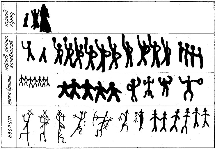 Рис. 49. Танцевальные сюжеты среди петроглифов Монголии