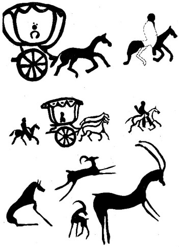 Интересны с точки зрения датировки и десятки изображений диких животных, разбросанных вокруг экипажей вперемежку с тамгами. Судя по цвету патины и по стилю изображения, эти рисунки одновременны кортежам. Силуэты козлов, архаров, антилоп, оленей, куницы, гиены с вывернутой передней ногой переданы в движении и удивительно пластичны. Козленок развернул голову назад, что уравновесило неустойчивость этой фигуры.